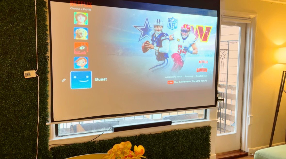Guests have full access to the 2BD/1BA unit, including a private balcony with city skyline views, a front porch, and a 100-inch projection home theater.